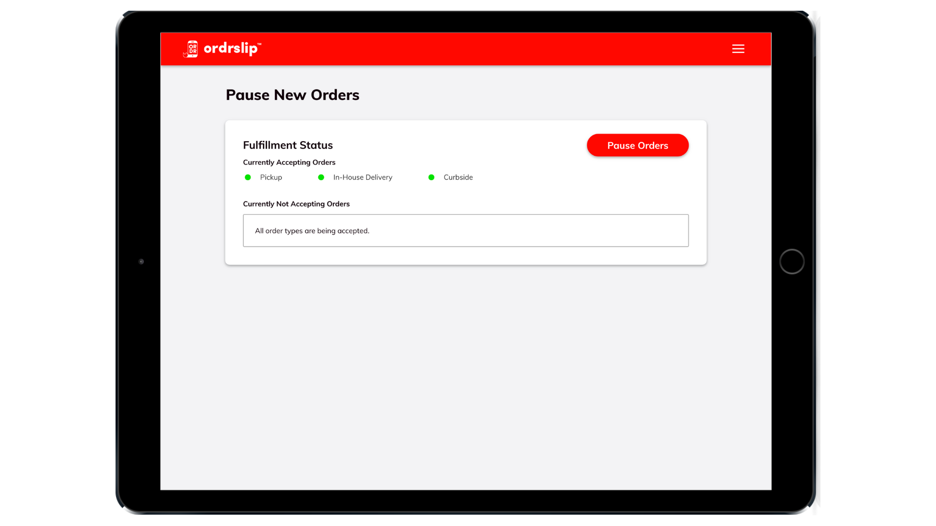 Busy restaurants rejoice: the Pause Button is here to give you a break! With Ordrslip’s new feature, you can slow down or stop orders at any time — so you can focus on orders already in the queue.